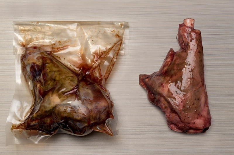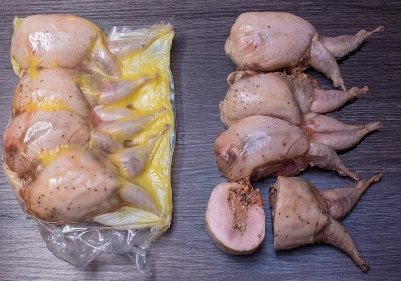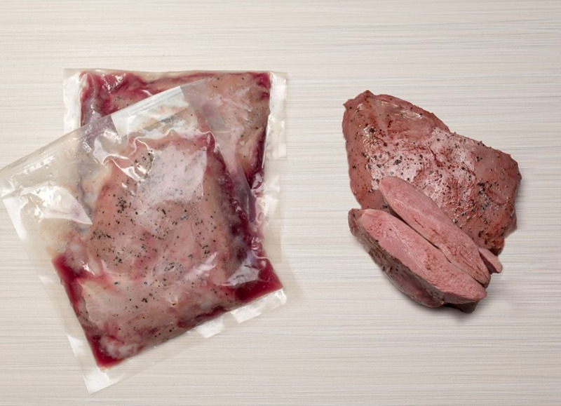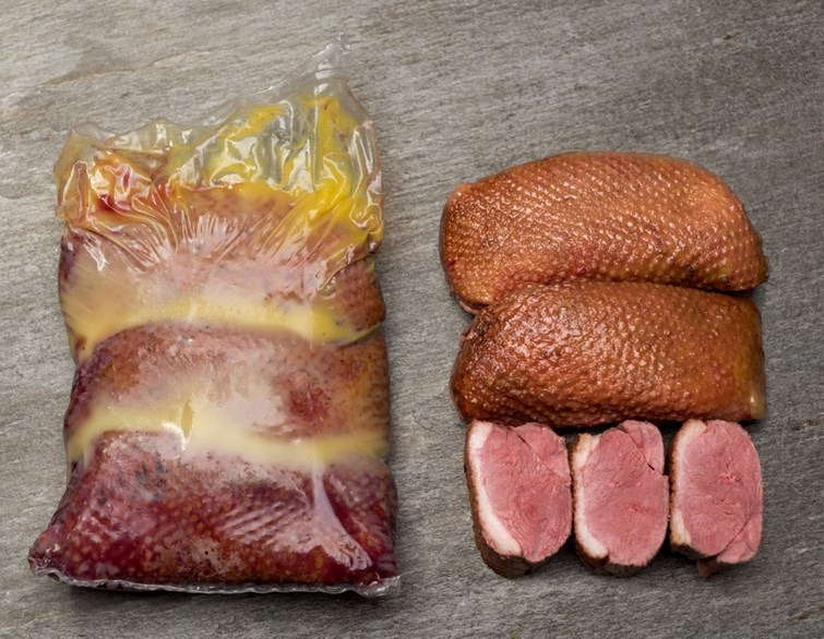 Nos viandes sont cuites sous-vide à basse température, ce qui permet d'en conserver toute la saveur, d'obtenir une texture tendre quelle que soit la pièce, de préserver les jus et même d'éviter la perte de poids durant la cuisson. Aucun ajout d'additif, simplement du gras de canard, du sel et du poivre !