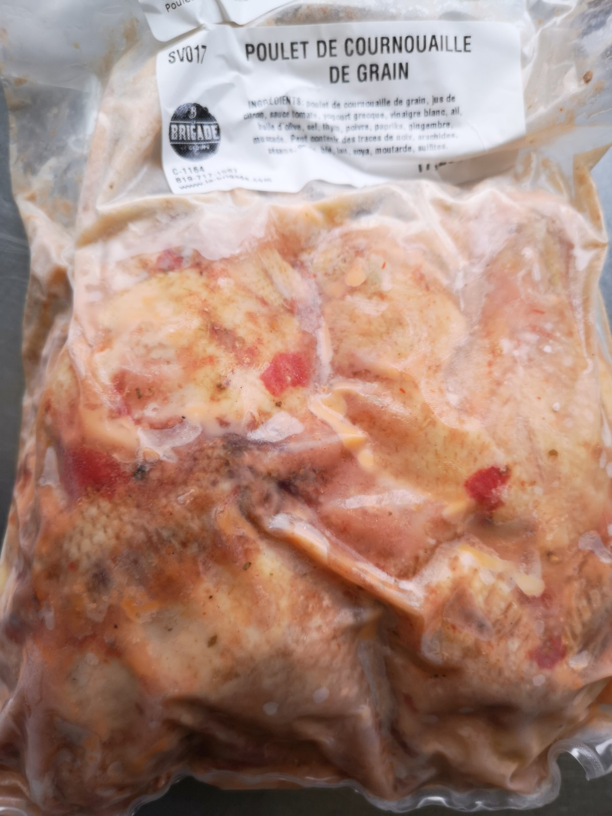 SV017 POULET DE CORNOUAILLES 12 unités/boîte (6x2) Poids unitaire approx. 300 gr Four Convection : Préchauffer le four à 375°F, déposer la viande avec un corps gras et réchauffer pendant 3-5 minutes Sur la Poêle: Sans corps gras, saisir 2 minutes de chaque côté. |